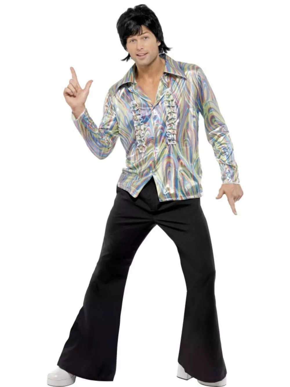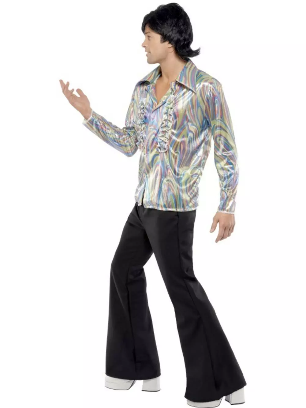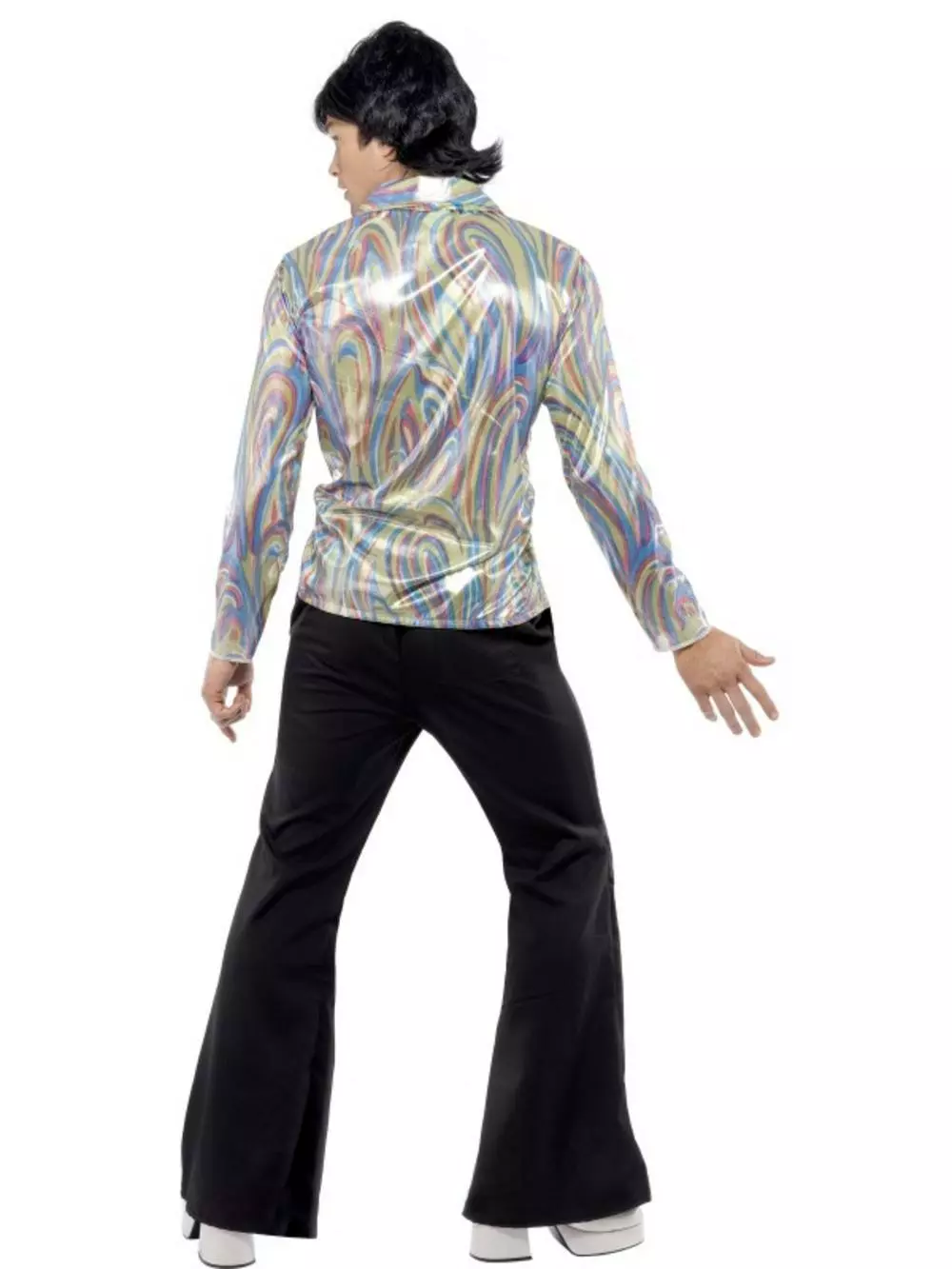and comprises of a shiny colourful psychedelic long sleeved shirt, and