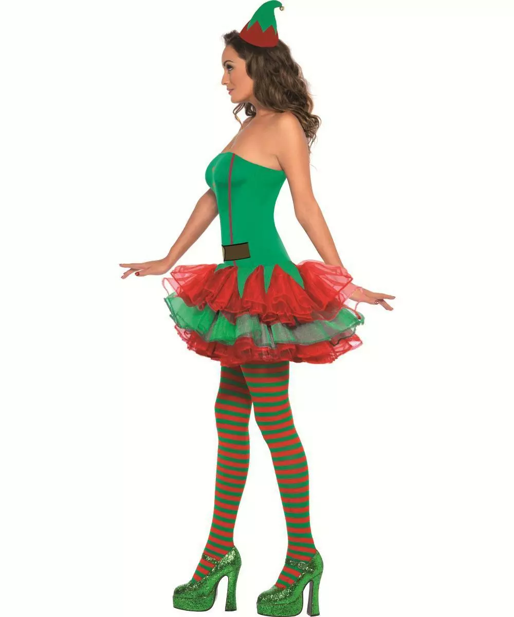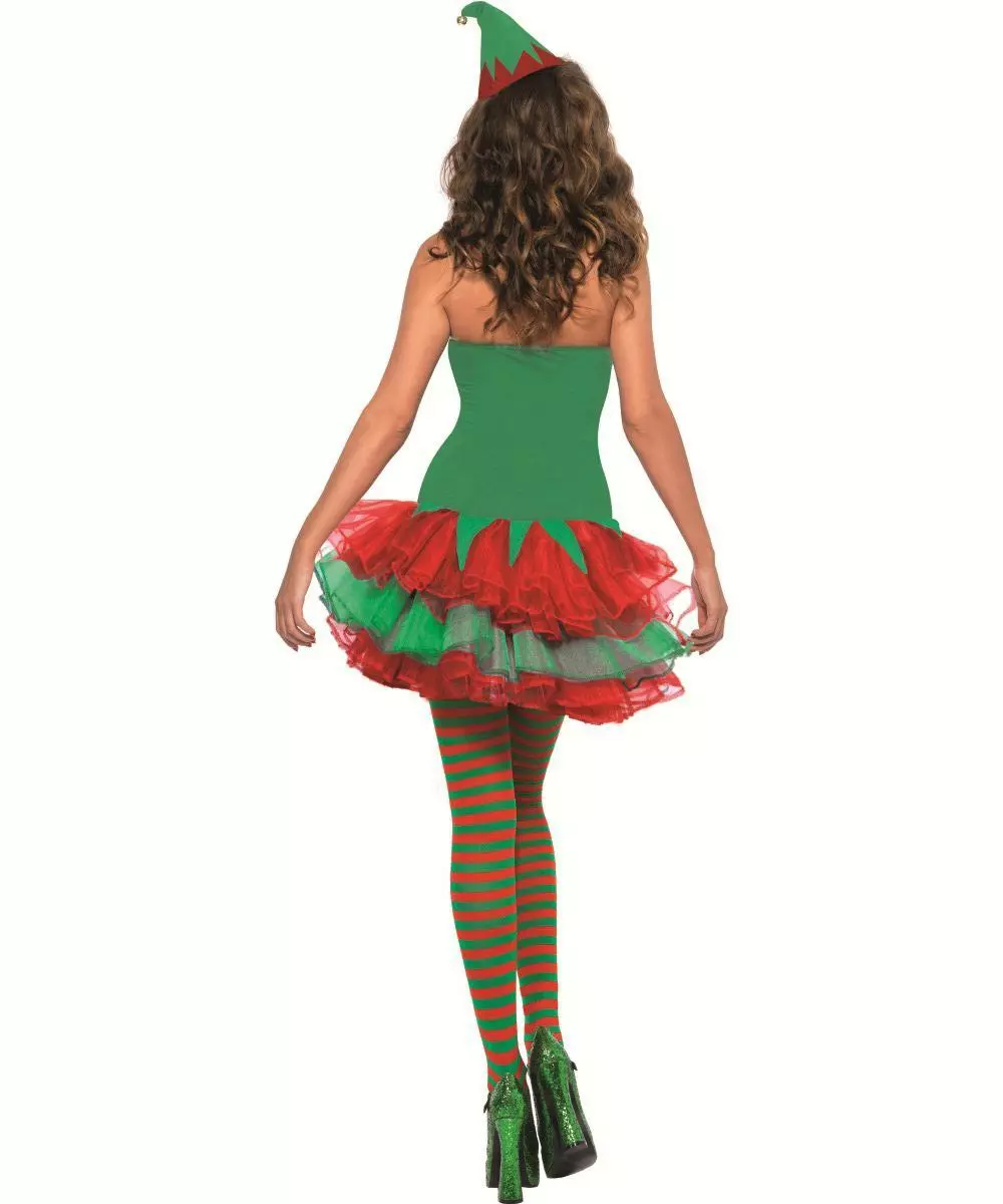 The cute Christmas Elf costume features a strapless green dress with