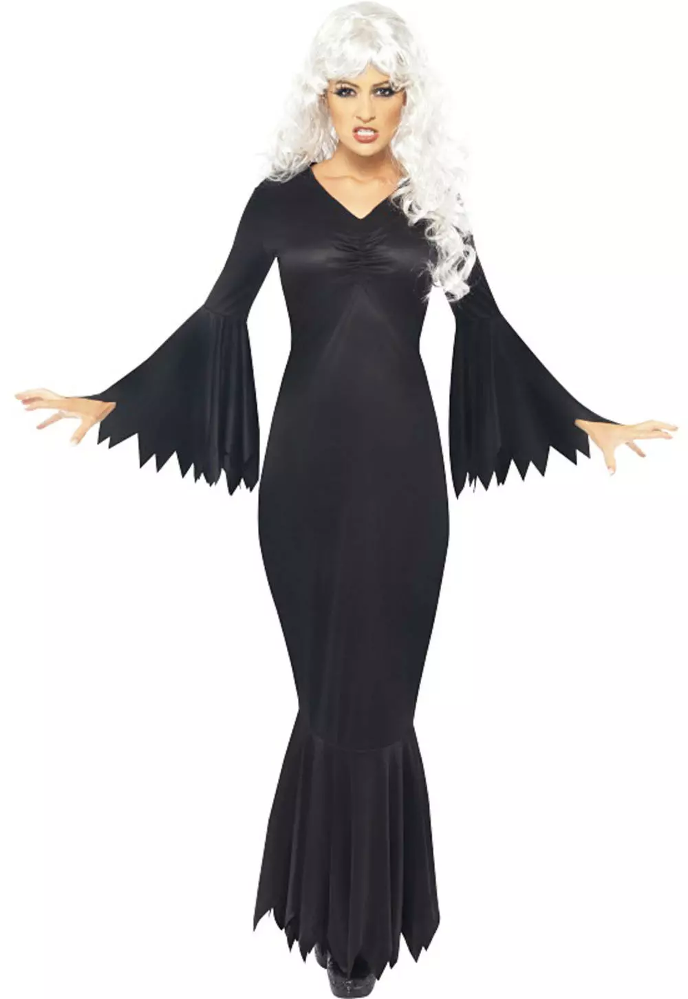 The blood-sucking dame would wear this long, V-neck, fitted black gown