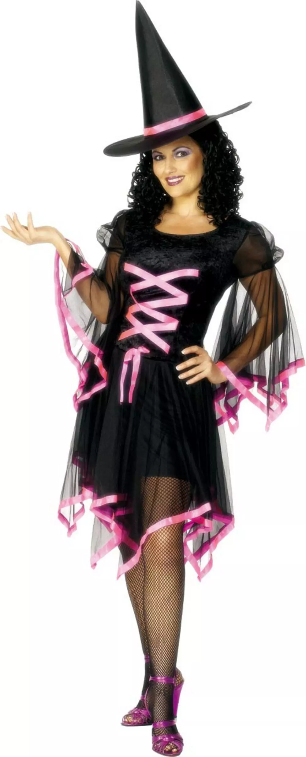 tall black hat with pink trim. A stylish and sexy Witch costume perfect